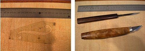 est entièrement taillée au canif. Elle se situe sous le pied gauche du chevalet dans le