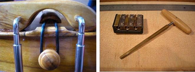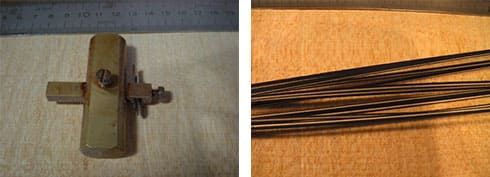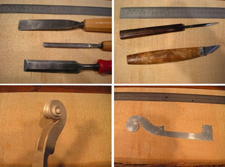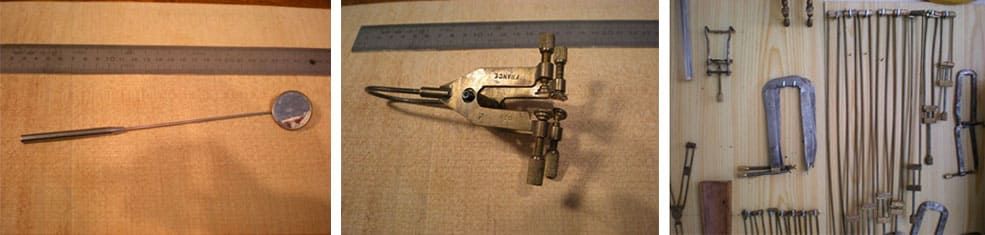 La lutherie nécessite un grand nombre d’outils spécifiques : comparateur d’épaisseur au 1/10ème, alésoir mâle et femelle pour les chevilles, pointe à âme, serre fracture, presse à tabler… Ceux-ci sont d’ailleurs souvent adaptés selon les besoins, ce qui a été souvent le cas pour faire face à la dureté du bois d’olivier (par exemple : légère transformation des angles d’affûtage).
