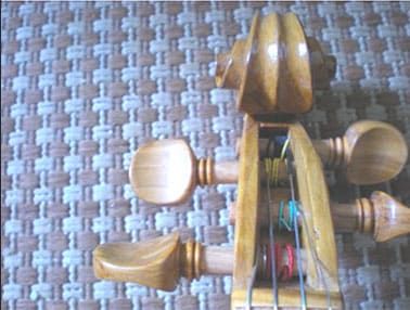 Sa fabrication est beaucoup plus libre autant sur le point de sa forme que sur celui de l’essence choisie. J’ai voulu conserver l’esprit de l’arbre en façonnant une mentonnière s’inspirant de la forme d’une feuille. Le système à filetage métallique pour fixer la mentonnière est, avec les cordes bien sûr, la seule partie que je n’ai pas complètement fabriquée.