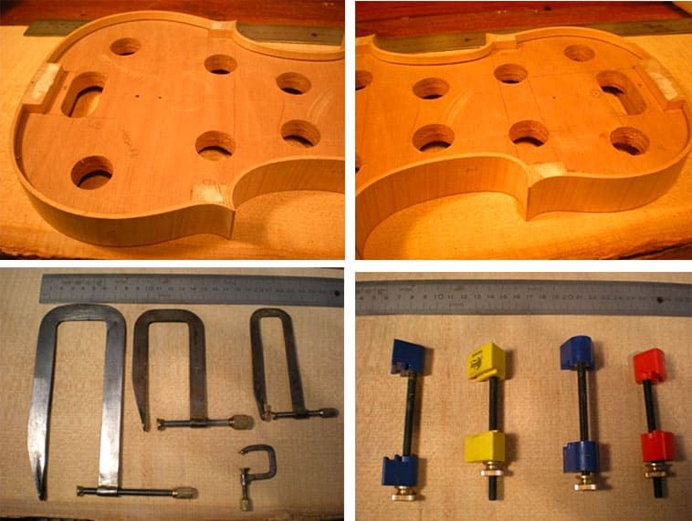 La surface des éclisses n’étant pas parfaitement plane, il est nécessaire de les aplanir au rabot avant d’y ajuster puis d’y coller la table d’harmonie et le fond. Pour ce faire, j’ai utilisé des presses dites « à tabler ».
