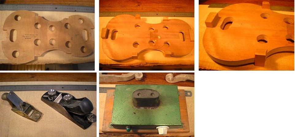 De nombreux gabarits sont utilisés pour la réalisation d’un violon mais celui des éclisses et contre- éclisses est fondamental. Dans un premier temps, il faut préparer et fixer des petits morceaux de bois taillés à la gouge à la forme souhaitée qui serviront de guide et de renforts pour les éclisses. On les appelle « tasseaux ».